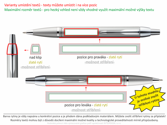 Možnosti umístění textů jsou znázorněné tlustou červenou čárou na obrázku níže s názvem "Umístění a barva rytiny". Jiné umístění textu není možné.