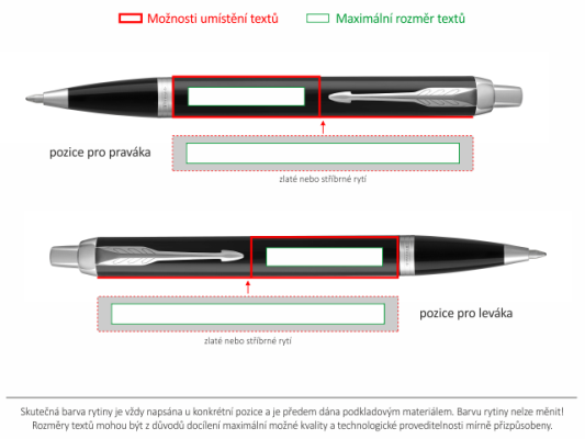 Možnosti umístění textů jsou znázorněné tlustou červenou čárou na obrázku níže s názvem "Umístění a barva rytiny". Jiné umístění textu není možné.