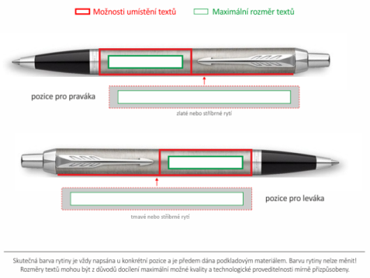 Možnosti umístění textů jsou znázorněné tlustou červenou čárou na obrázku níže s názvem "Umístění a barva rytiny". Jiné umístění textu není možné.