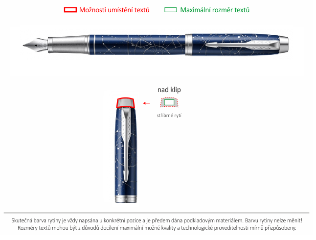 Možnosti umístění textů jsou znázorněné tlustou červenou čárou na obrázku níže s názvem "Umístění a barva rytiny". Jiné umístění textu buď není možné, nebo jen po předchozí dohodě s námi.Jak objednat pero Parker s rytinou?