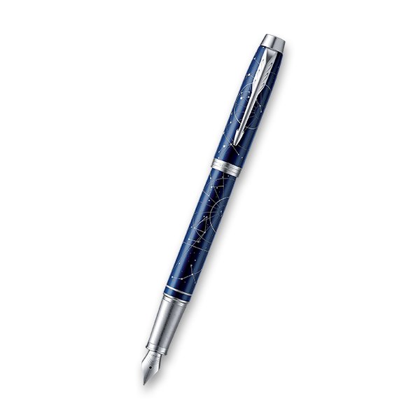 Sada plnicí pero a kuličková tužka v dárkové kazetě. Tělo a víčko z nerezové oceli, zdobené modrým lakem s prvky vytvářejícími schéma souhvězdí. V kombinaci s mosaznými doplňky pokovenými chromem. Hrot z ušlechtilé nerezové oceli.