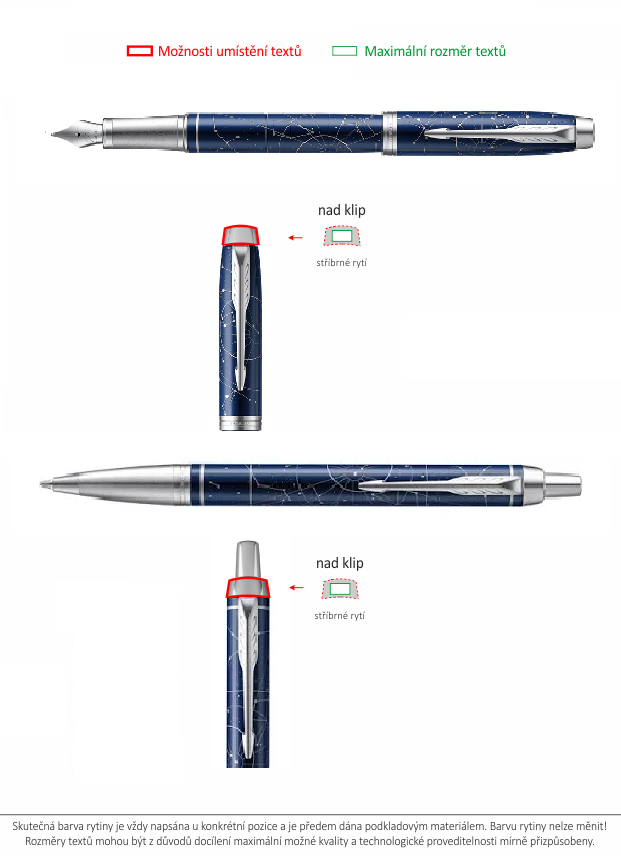 Možnosti umístění textů jsou znázorněné tlustou červenou čárou na obrázku níže s názvem "Umístění a barva rytiny". Jiné umístění textu buď není možné, nebo jen po předchozí dohodě s námi.Jak objednat pero Parker s rytinou?