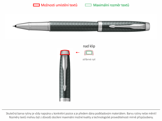 Možnosti umístění textů jsou znázorněné tlustou červenou čárou na obrázku níže s názvem "Umístění a barva rytiny". Jiné umístění textu buď není možné, nebo jen po předchozí dohodě s námi.Jak objednat pero Parker s rytinou?