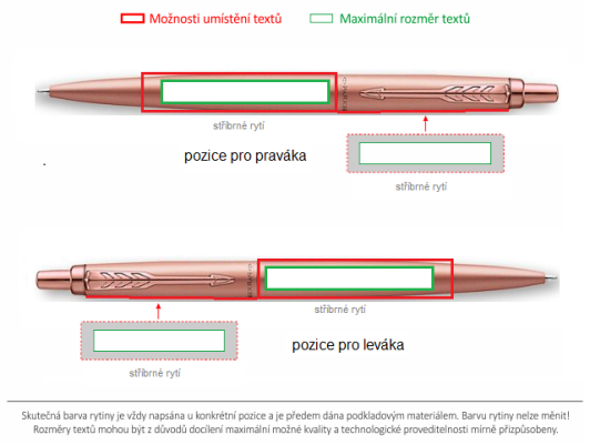 Možnosti umístění textů jsou znázorněné tlustou červenou čárou na obrázku níže s názvem "Umístění a barva rytiny". Jiné umístění textu buď není možné, nebo jen po předchozí dohodě s námi.Jak objednat pero Parker s rytinou?