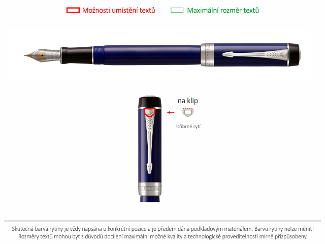 Možnosti umístění textů jsou znázorněné tlustou červenou čárou na obrázku níže s názvem "Umístění a barva rytiny". Jiné umístění textu buď není možné, nebo jen po předchozí dohodě s námi.Jak objednat pero Parker s rytinou?