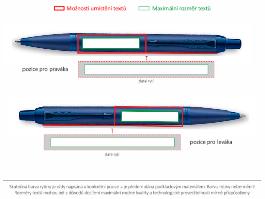 Možnosti umístění textů jsou znázorněné tlustou červenou čárou na obrázku níže s názvem "Umístění a barva rytiny". Jiné umístění textu není možné.