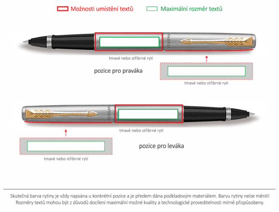 Barvu laserového gravírování si můžete na tomto modelu Parker vybrat stříbrnou nebo tmavou. Stříbrná barva gravírování je dencentnější, tmavá je naopak vidět na první pohled. Text bude ale v každém případě vždy hezký a dobře čitelný.