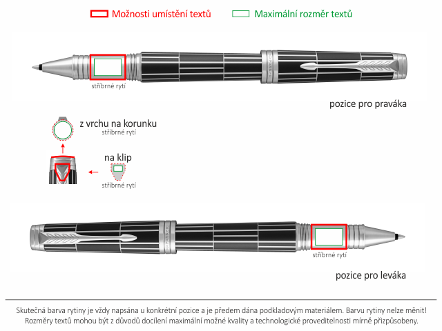Možnosti umístění textů jsou znázorněné tlustou červenou čárou na obrázku níže s názvem "Umístění a barva rytiny". Jiné umístění textu buď není možné, nebo jen po předchozí dohodě s námi.Jak objednat pero Parker s rytinou?